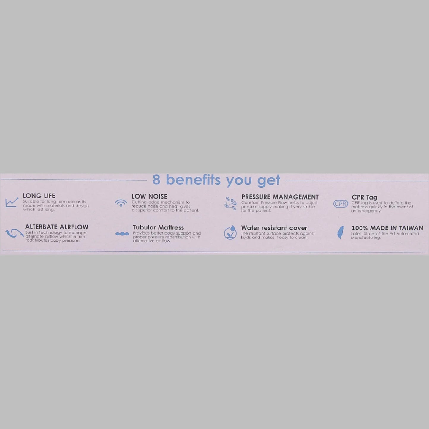 Karma Health Care Tubular Air-Wave Mattress T1 is a medical air mattress to alleviate bedsores in people with restricted mobility. Its tubular design and material make it last longer. The low-noise airflow mechanism and heat lends a superior comfort to the patients. It is safe against any spillage.