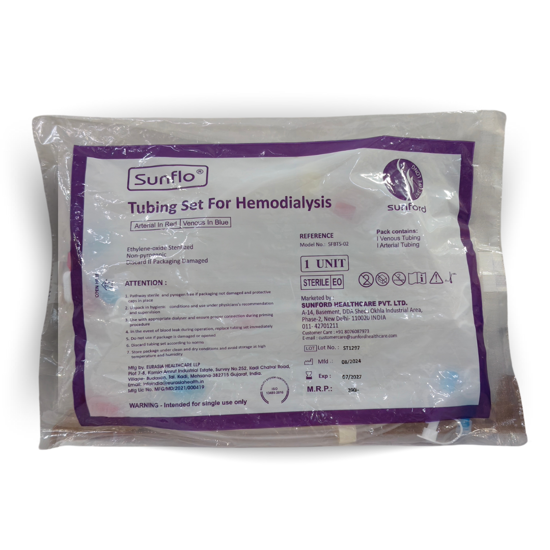Ensure safe and efficient dialysis treatment with the Sunflo Hemodialysis Tubing Set, designed for single use with optimal patient safety in mind. This EO-sterilized, non-pyrogenic tubing set includes 1 Arterial and 1 Venous line (in blue) and is compatible with most dialysis machines. Packaged with high-grade medical materials, it supports smooth blood flow, minimizes clotting risks, and maintains patient hygiene.