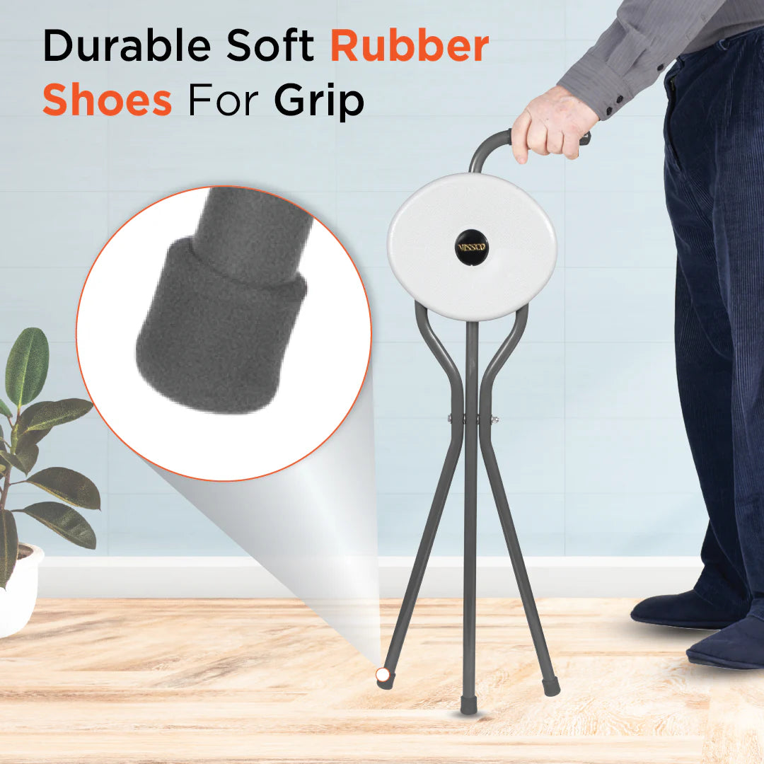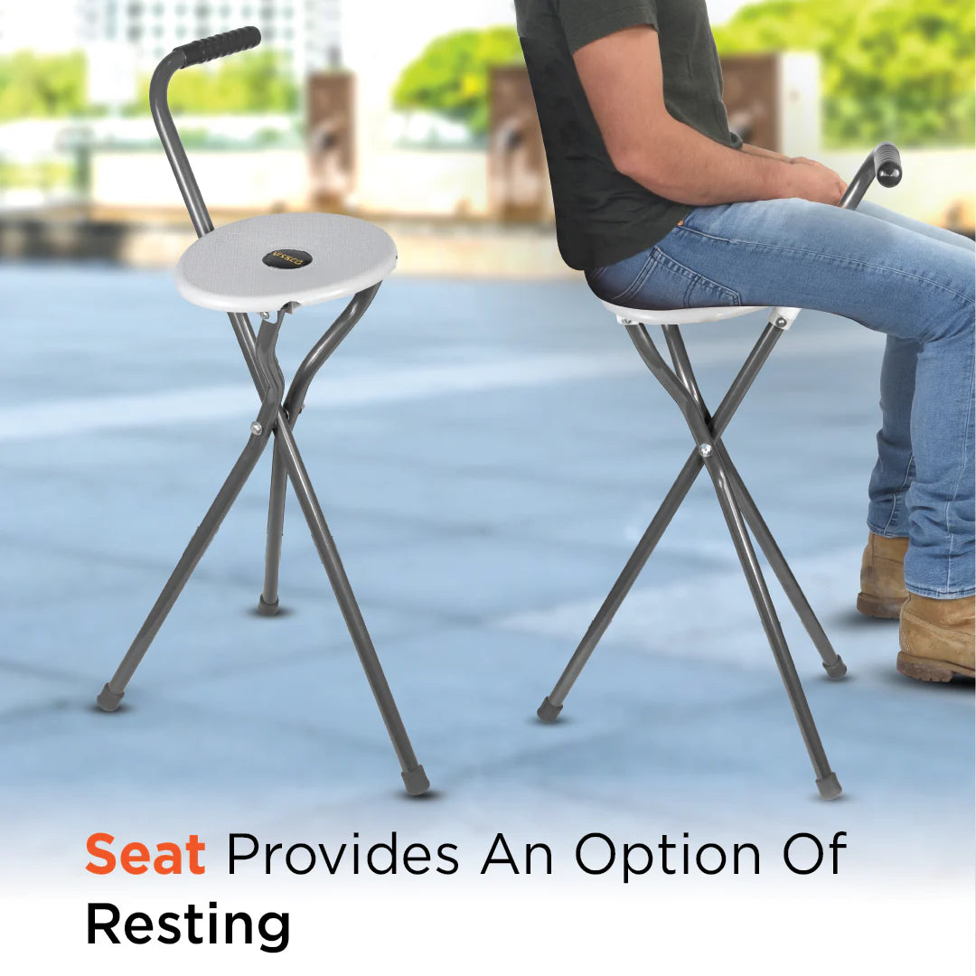 Vissco Avanti Walking Stick with Seat – PC 0944 | L-Shaped Handle, Lightweight, Foldable, Durable Rubber Shoe (Grey)